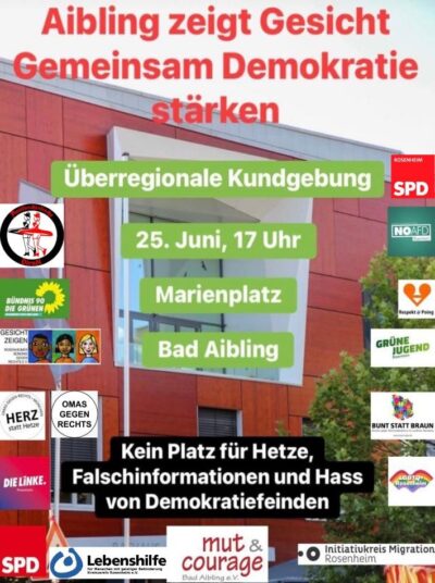 Kemmts bitte olle am Sonntag, 25.06.23 um 17:00 Uhr nach Bad Aibling an Marienplatz. Bringts eire Demoschuidl mit, guade Laune, eine Familien und Freind*innen.